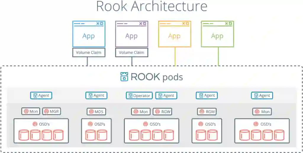 另一个有趣且颇具人气的项目是Rook,这是一项旨在将Kubernetes与Ceph融合起来的技术方案。从本质上讲,它将计算节点和存储节点放进了同一个集群当中。