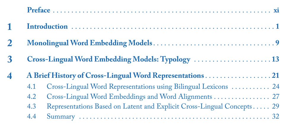 四位作者在《Cross-Lingual Word Embeddings》一书中,研究并讨论了从之前到近阶段关于此类对齐的监督和无监督学习研究。具体而言,这本书系统性地探讨了「跨语言词嵌入」问题,全书使用了一致的符号,并以可比较的形式介绍可用方法,从而帮助读者更容易地对比大量不同方法。