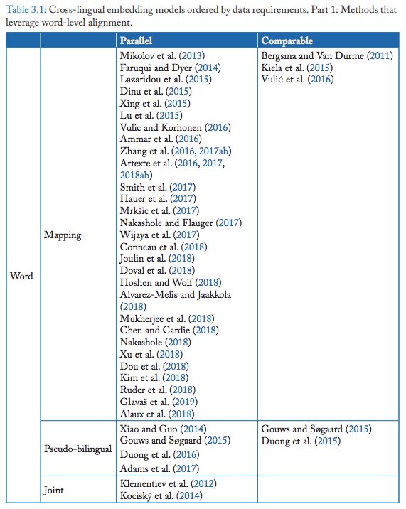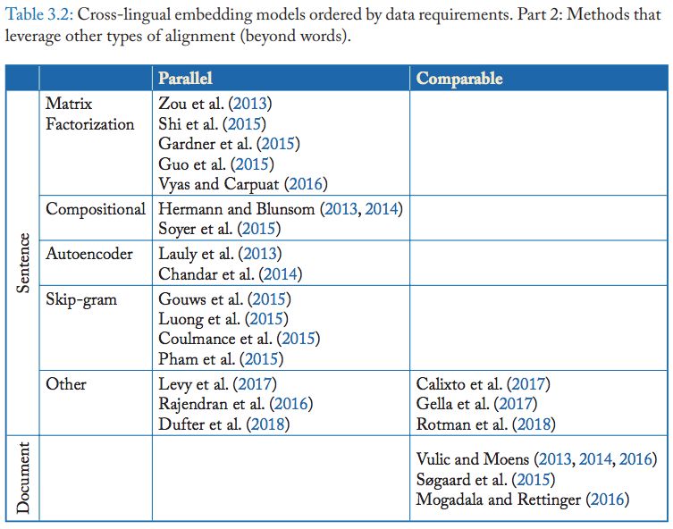 对齐类型:跨语言词嵌入模型使用不同类型的双语监督信号:词级、句子级、文档级。一些监督信号更细粒度,例如,词级对齐更容易展示两个单词在对应语境中是否语义对应或类似;但有时候研究者需要依赖较为粗粒度的信号,比如将句子或文档进行对齐。