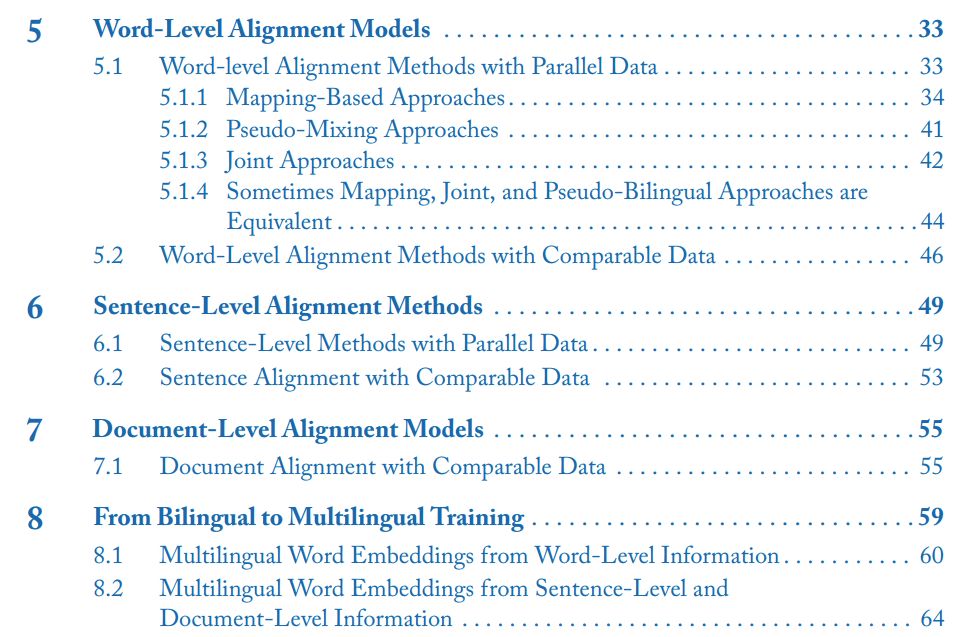第九章介绍了,不依赖于显式双语监督信号、以无监督方式学习跨语言词嵌入的近期研究;