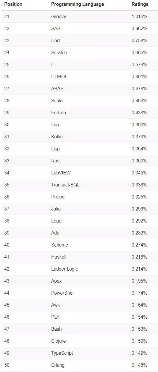 2018年其他大有进步的编程语言有MATLAB(第18到第11位)、Kotlin(第39到第31位)、Rust(第46到第33位)、Julia(第47到第37位)和TypeScript(第167到第49位)。
