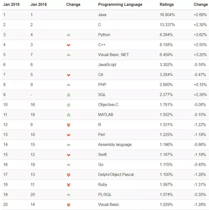 注意:SQL 自 2018 年 2 月起被重新添加到了 TIOBE 排行榜中,由于没有以往的数据可以对比,增长速度非常快,现在位居第 9 名。