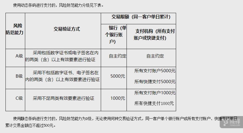 央行对于现在的支付手段进行了风险防范能力分级,可以分为 A\B\C\D 四级。A 级最高,为采用包括数字证书或电子签名在内的两类(含)以上有效要素对交易进行验证的,不强制限制交易额;B 级为采用不包括数字证书、电子签名在内的两类(含)以上有效要素对交易进行验证的二维码支付,单个银行和支付账户单日累计交易金额不超过5000元。