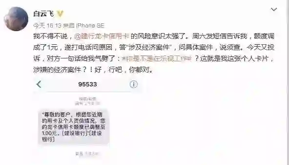 社交媒体上曝出,3年前曾服务于乐视的员工,其建设银行信用卡额度被调成1元的消息。根据微博账号为白云飞的网友介绍,自己的建设龙卡信用卡额度在上周六被调成1元钱。白云飞向建行方面投诉,对方则问“你是不是在乐视工作?”白云飞称,自己的信用卡也办理使用了9年多,是在未进入乐视之前办理的。有消息称,许多乐视员工的建行龙卡信用卡额度都被调整为1元。