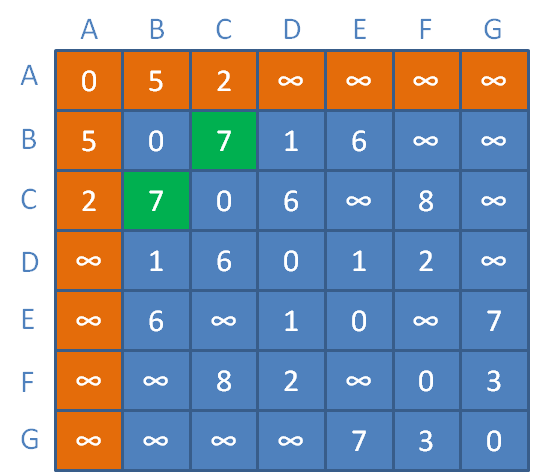 {INF, 6, INF, 1, 0, INF, 7},