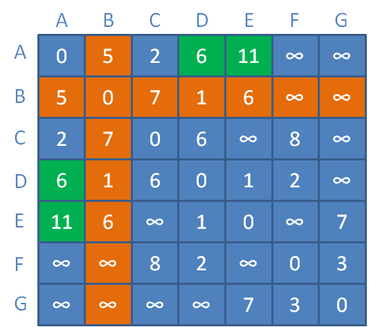 更新对应矩阵元素(橙色区域代表顶点A到其他顶点的临时距离):