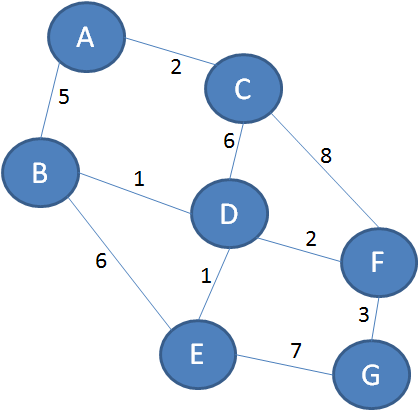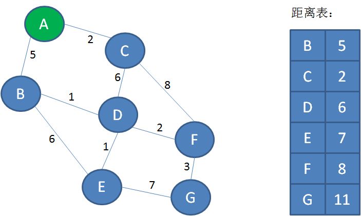 第一步,利用迪杰斯特拉算法的距离表,求出从顶点A出发,到其他各个顶点的最短距离: