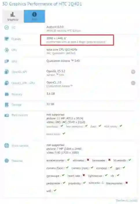 HTC已经宣布将于11月2日在台北举办新品发布会,U系列旗舰U11 Plus届时将正式亮相。现在关于这款新机的细节信息陆续揭晓,继GeekBench曝光HTC U11 Plus参数后,知名跑分网站GFXBench上也出现了这款设备。GFXBench显示,HTC U11 Plus型号为2Q4D1,它采用了6英寸显示屏,分辨率为2880×1440,屏幕纵横比为18:9,搭载骁龙835处理器,配备4GB内存+64GB存储,前置摄像头为800万像素,后置摄像头为1200万像素。