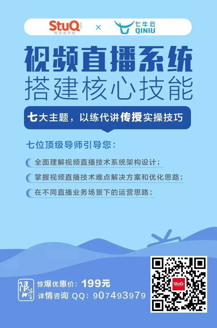 StuQ联合七牛云匠心打造,直播时代的程序员必修课《视频直播系统搭建核心技能》现已上线,7位顶级导师以讲带练传授,7大主题深度剖析技巧,引导您全面理解视频直播技术系统架构设计、掌握视频直播技术难点和解决方案以及优化思路、并且介绍在不同直播业务场景下的运营思路。