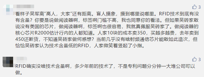 近日,“全球物联网观察”就“RFID技术含量低”这个话题与相关从业展开讨论。著名学者吴军认为:“不具有太多技术含量的所谓智能硬件其实不值钱。”,他在直播平台进行演讲时提到,制造RFID芯片和读写器的企业就属于这种技术含量不是太高的部分。(吴军称RFID技术含量低,企业“怒了”!)