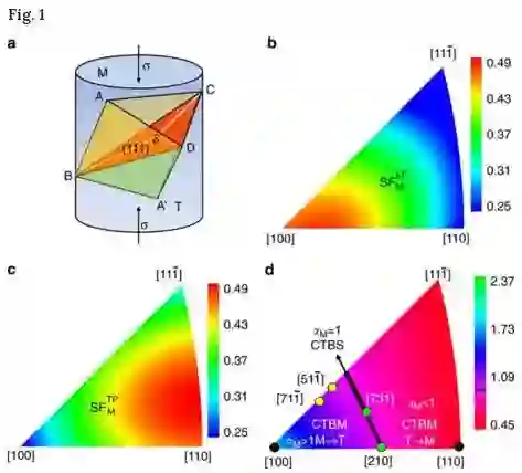 但共格孪晶界为什么不能发生滑移呢?带着这一问题,西安交大材料学院微纳中心单智伟教授研究团队与合作者们首先从理论上进行了深度分析和系统研究,结果发现共格孪晶界应该能够发生滑移,其先决条件是加载方向要能使得先导分位错(leading partial dislocation)与拖曳分位错(trialing partial dislocation)的施密特因子的大小相当,并交替形核和运动,作者们进而绘制出了共格孪晶界滑移变形与加载方向之间的关系图,该图可完全预测给定加载方向时共格孪晶界的变形行为。