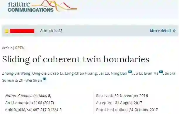 美国工程院院士布朗大学高华建教授评论到:“此发现有可能在根本上改变我们对纳米孪晶金属的塑性变形的理解,共格孪晶界是工程化设计具有优越的机械和物理性能(强度、延展性、韧性、导电性和热稳定性)的新型纳米孪晶材料的关键因素,这篇文章揭示了大规模的共格孪晶界滑移,大大推进了人们对这一领域的认识。”