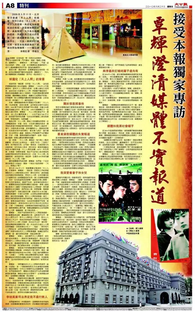 但是,他不信任大陆的媒体,他拒绝接受大陆媒体采访。唯一一次见大陆媒体是约胡舒立,他曾当面问她,你们怎么算出我的银行贷款?怎么能这样算?《财经》那篇把覃辉调查了个底朝天的报道,想必覃辉是恨死了。他唯一一次接受媒体专访是香港大公报,专访的版面被他贴在这则声明里。那篇专访里的覃辉爱妻顾家,清白规矩。大陆媒体间相传的那个“准黑道”、“背景过硬”、“无赖”的覃辉是“天上人间前老板”。覃辉说,那不是他。
