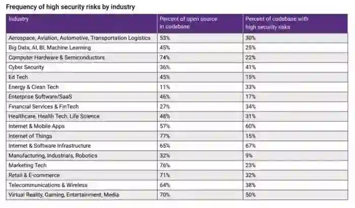 Black Duck 还发现,78% 的代码库包含至少一个与开源组件相关的安全漏洞,平均每个代码库发现 64 个漏洞。