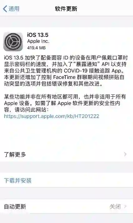 【苹果发布iOS 13.5正式版:优化戴口罩解锁手机的方式】21日,苹果发布了iOS和iPadOS 13.5正式版的更新。新系统优化了面容ID,iPhone用户可以带着口罩解锁手机,即当iPhone检测到用户戴着口罩时,会直接弹出密码输入界面,不需要反复向上滑动。iOS和iPadOS 13.5系统中,还包含了新型冠状病毒肺炎接触者追踪技术API,允许健康组织开发新型冠状病毒肺炎追踪App。(硅谷分析师)