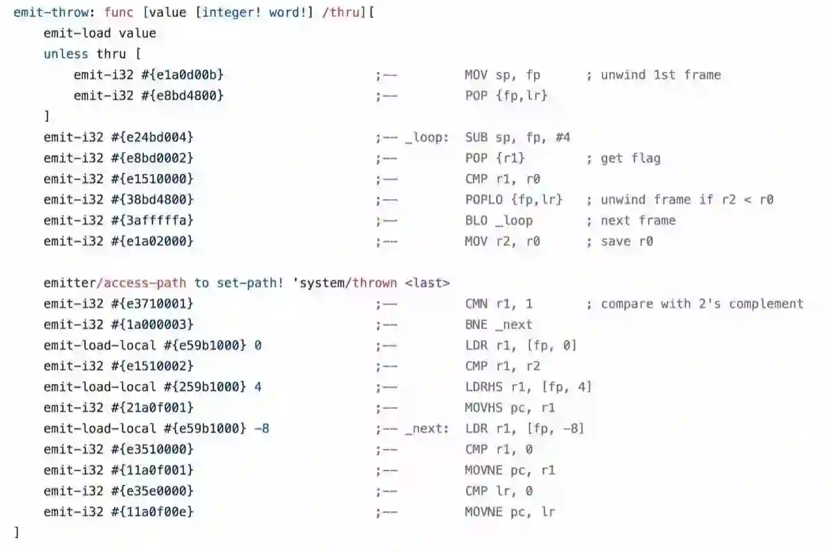 大多数语言,编译出来的目标代码连语言他爹都不是特别清楚会长什么样,可 Nenad 竟然匪夷所思且丧心病狂地为 red 手写 arm/ia32 的 assembly / machine code(见:https://github.com/red/red/blob/master/system/targets/ARM.r),其功力可见一斑。比如这个 throw exception 时的 stack unwind: