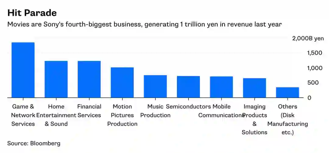 业务构成:电影是索尼第四大业务,2017年创造了1万亿日元的收入。资料来源:彭博新闻社