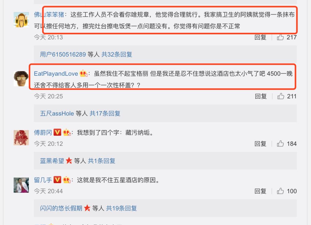 同样是万豪集团的,上海宝格丽酒店,这家奢侈品牌同名酒店4500元/晚,服务员从垃圾桶里回收一次性的塑料杯盖用自己的T恤擦一下重复使用,用客人擦过脸的小方巾擦杯子和洗手台;