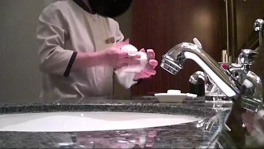 四季集团旗下的上海四季酒店,服务员拿着一块海绵擦完洗澡间的毛巾擦杯子和洗手池,再用未经过清洗的脏毛巾擦干台面和杯子,对,先擦台面,再擦杯子;