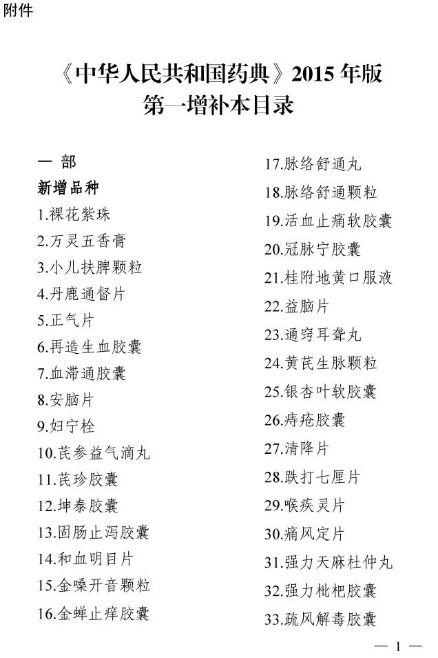 2018年7月5日,国家药品监督管理局发布《中华人民共和国药典》2015年版第一增补本,自2019年1月1日起施行。