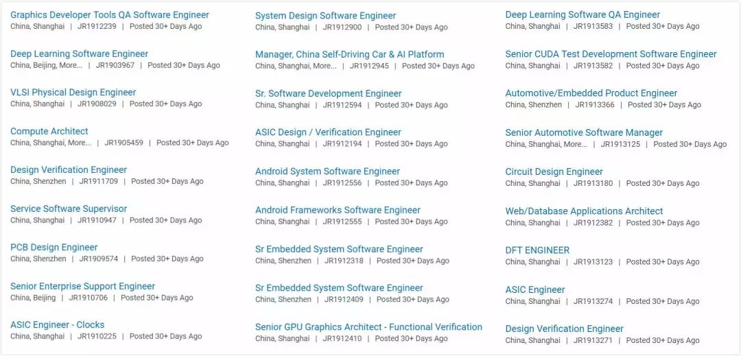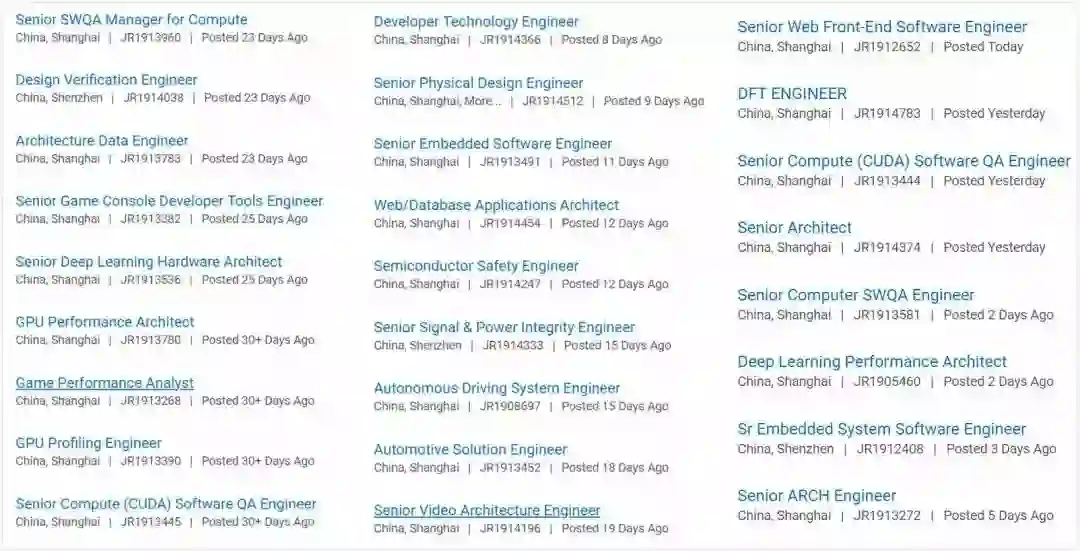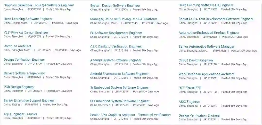 我们发现,英伟达在北京、上海、深圳有招聘架构工程师相关的职位,但是否中美有别,中国的研发人员能否参与核心的研发工作,我们不得而知。