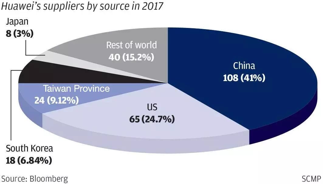 不过,华为并不是那么好学的。而且就算华为花费重金,在核心技术领域持续多年投入,但是很多关键的零部件和软件仍然受制于美国,根据彭博社的数据,2017 年华为的供应商有 24.7% 来自美国,而且华为研发的操作系统也因为没有生态而不能推出市场。