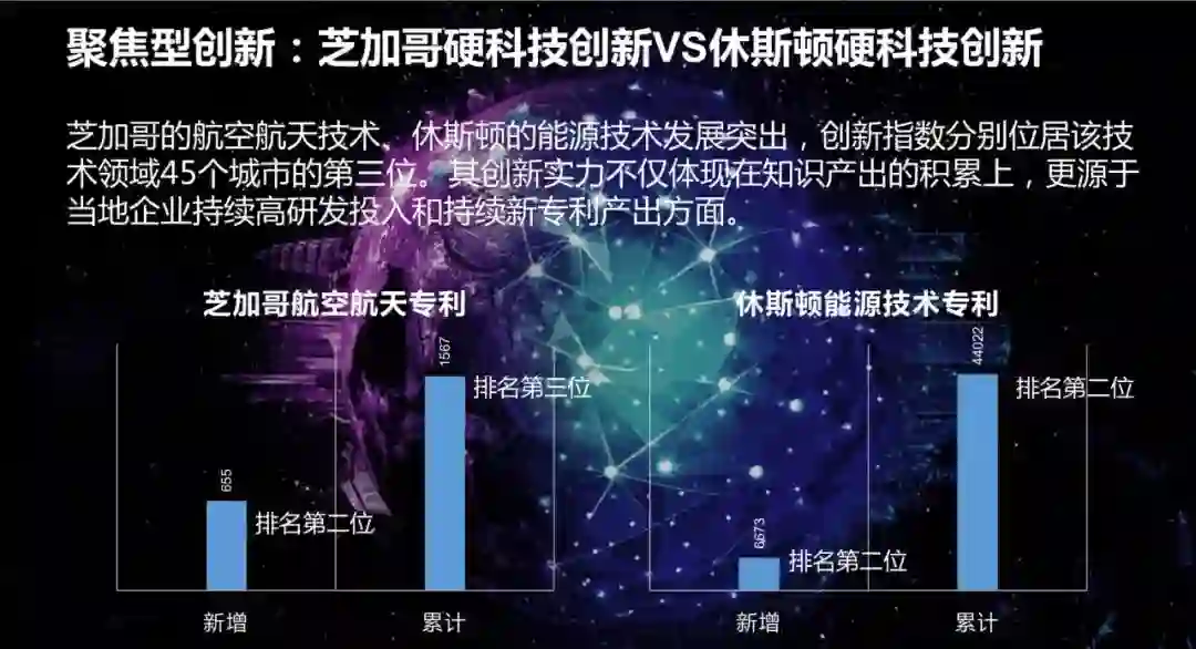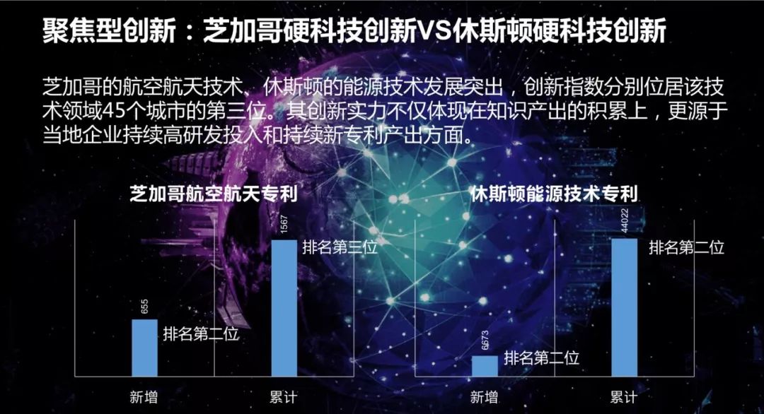 聚焦型创新城市是芝加哥和休斯顿。芝加哥主要是航空航天技术,休斯顿是能源技术,这方面都位居全球前列。