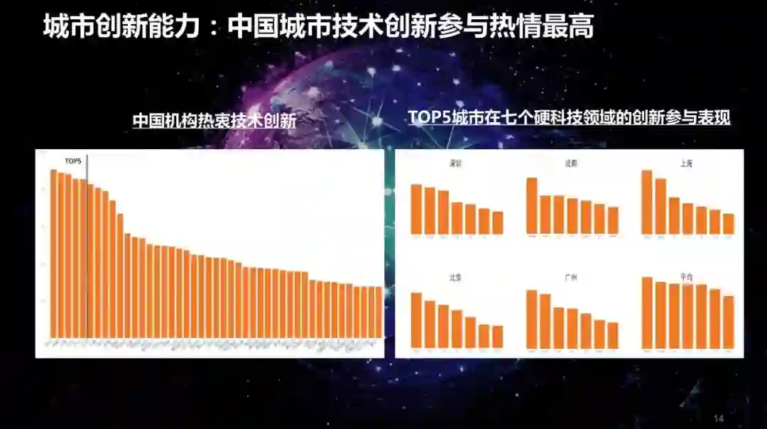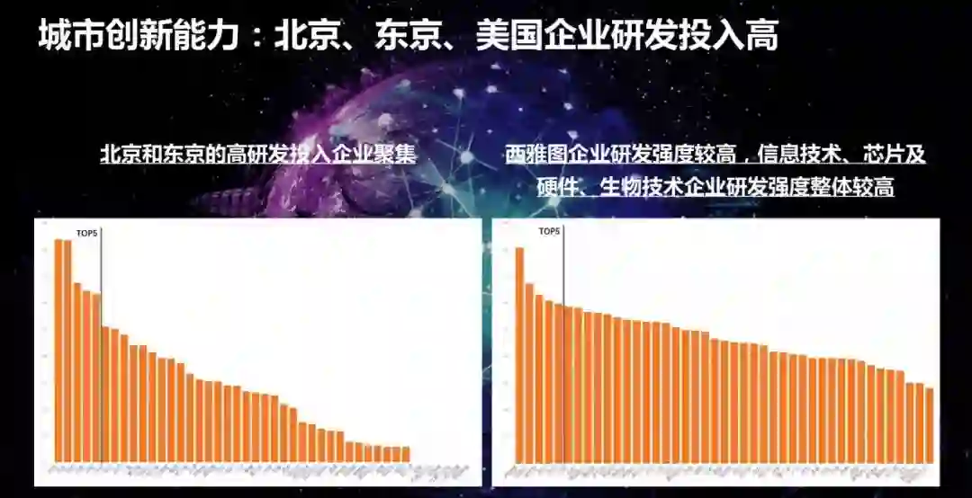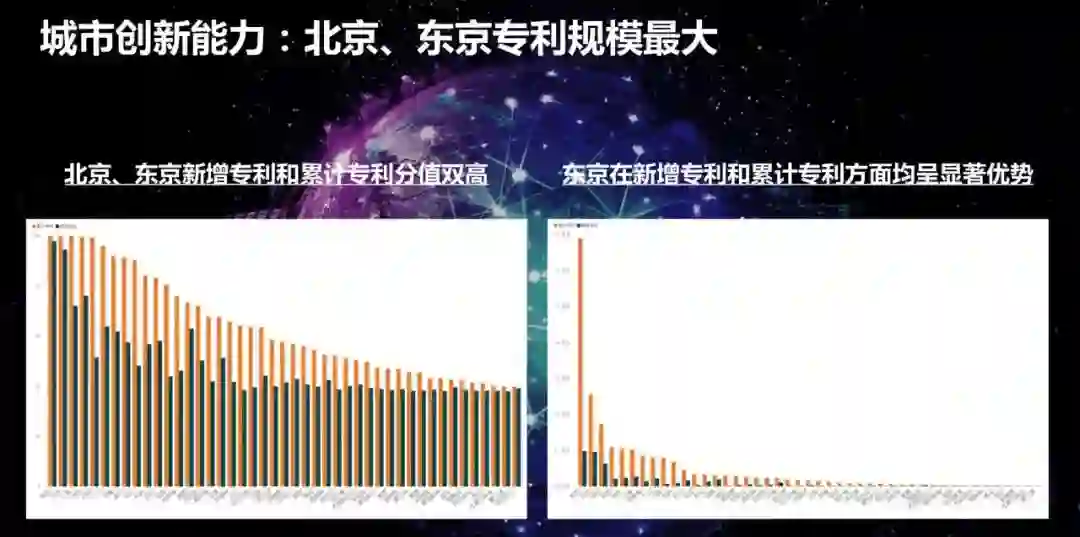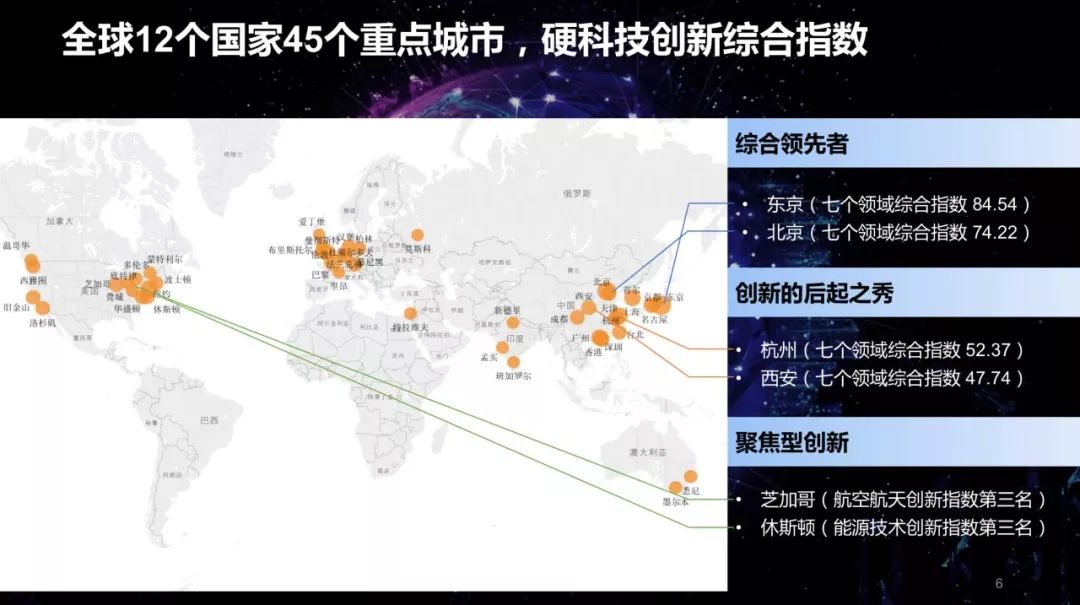 经过对数据的分析发现东京和北京是排名第一第二,是属于综合的,全面领先的。杭州和西安是作为创新的后起之秀,为什么叫后起之秀,是指它在创新的增速上和创新的表现非常突出,超出了我们对它的城市原来的设想和预期。另外一个聚焦型创新是芝加哥和休斯顿。