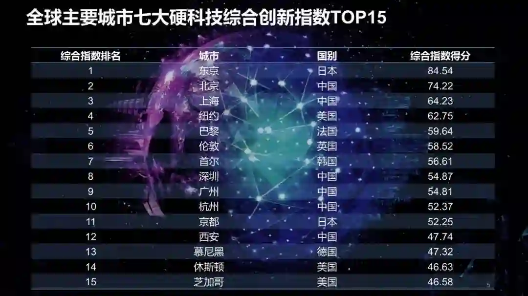 这个指数首次在全球范围选取城市进行硬科技指数排名,可以看到中国的城市这次选了十个,并不是特别多。我们希望明年把城市的数量会再扩大一些。我们指数的排名排出了TOP15的城市,主要的国家有日本、中国、美国、法国、英国。