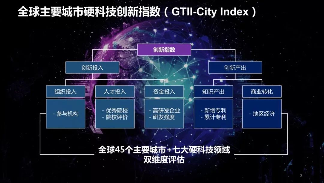 下面我为大家发布全球硬科技城市指数。我们全球主要城市硬科技创新指数是由国务院发展研究中心国际技术经济研究所,中科创星和北京知本创业共同研究发布。这个指数主要的数据从两个方面来评价,第一是创新投入,第二是创新产出。创新投入分人才投入、组织投入和资金投入。