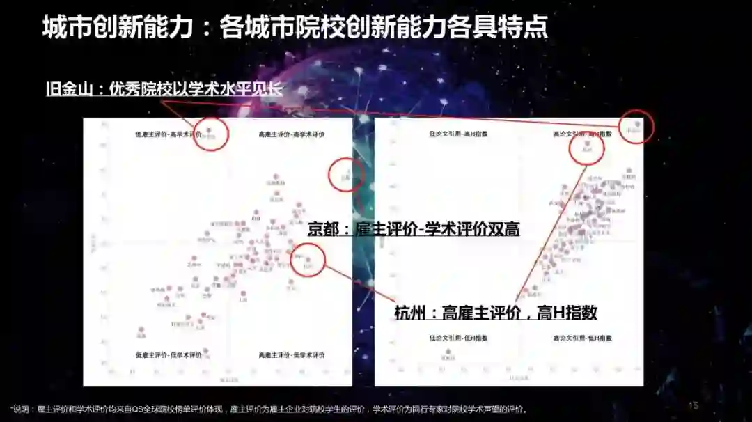 另外从不同的城市来看,比如说旧金山、京都和杭州他们都有自己的一些特色,在学校的学术水平,有的是雇主评价,有的是论文的H指数上都各有特点。