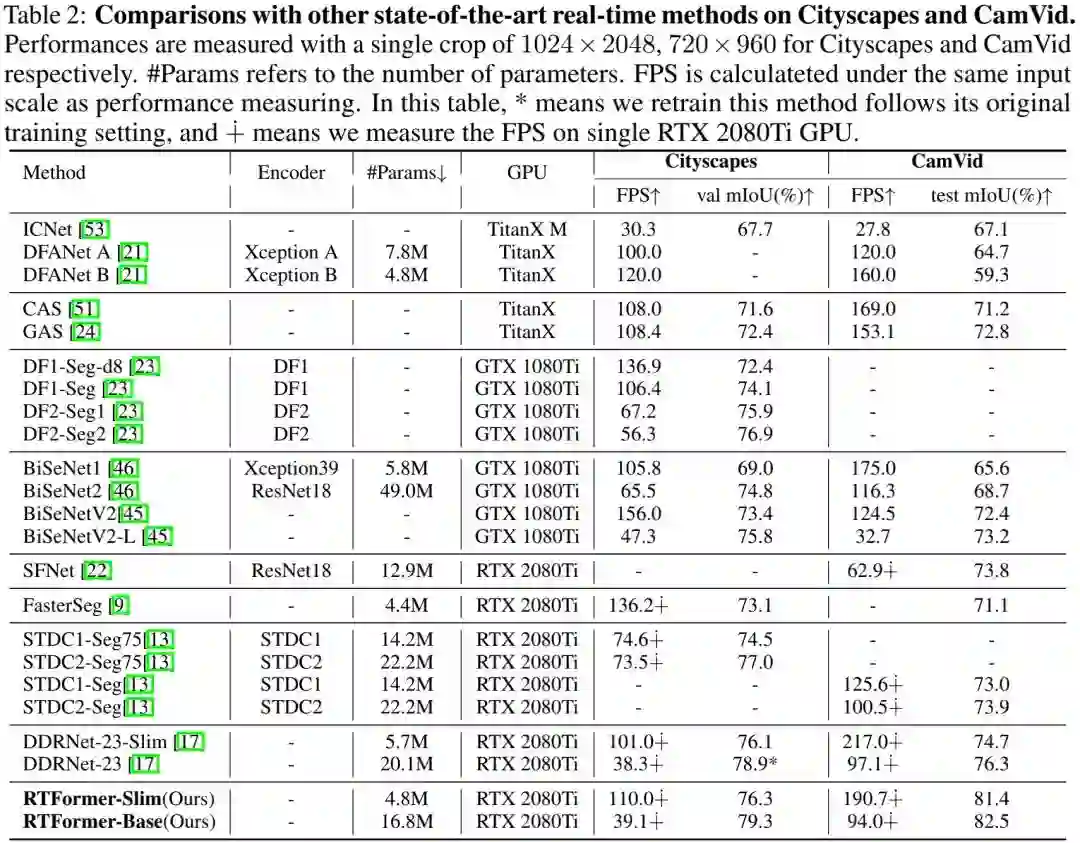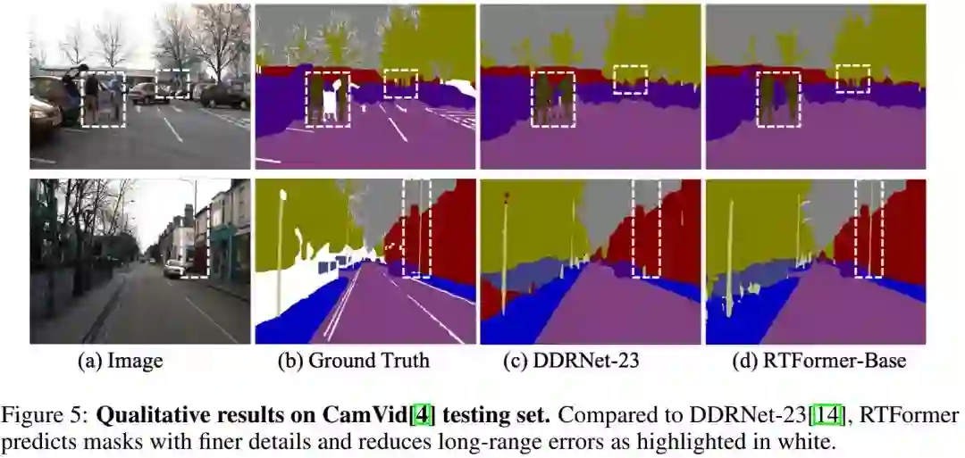 为达成GPU设备上的高推理效率,所提RTFormer采用了线性复杂度的GPU友好注意力模块,同时消除了多头机制。此外,作者发现:跨注意力机制对于全局上下文信息聚合非常有效。多个主流基准数据集(Cityscapes, CamVid, COCOStuff, ADE20K)上的实验结果验证了所提RTFormer的有效性。下图给出了CAMVid数据集上不同方案的性能与推理速度对比,很明显:RTFormer具有最佳的性能-速度均衡。