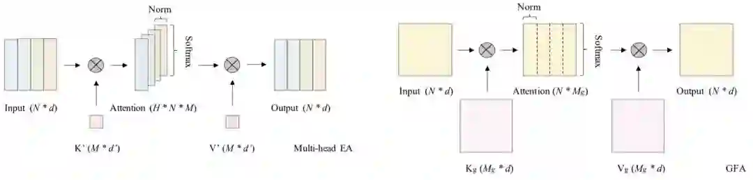 GPU-Friendly Attention 相比其他类型的注意力,作者发现:External Attention(EA,见上图左)因其线性复杂度可成为GPU设备的潜在选择。基于此,作者提出了GPU-Friendly Attention(GFA,见上图右)。我们首先对EA进行简要介绍,假设 表示输入特征,那么EA可以描述如下: