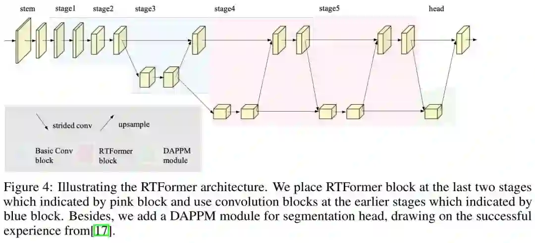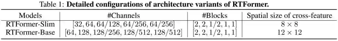 上表给出了RTFormer-Slim与RTFormer-Base的架构配置信息,很明显,RTFormer的骨干部分由5个stage构成,其中3-5stage由对偶分辨率特征构成,在分割头方面,RTFormer引入了DPPM模块进一步提取多尺度特征。
