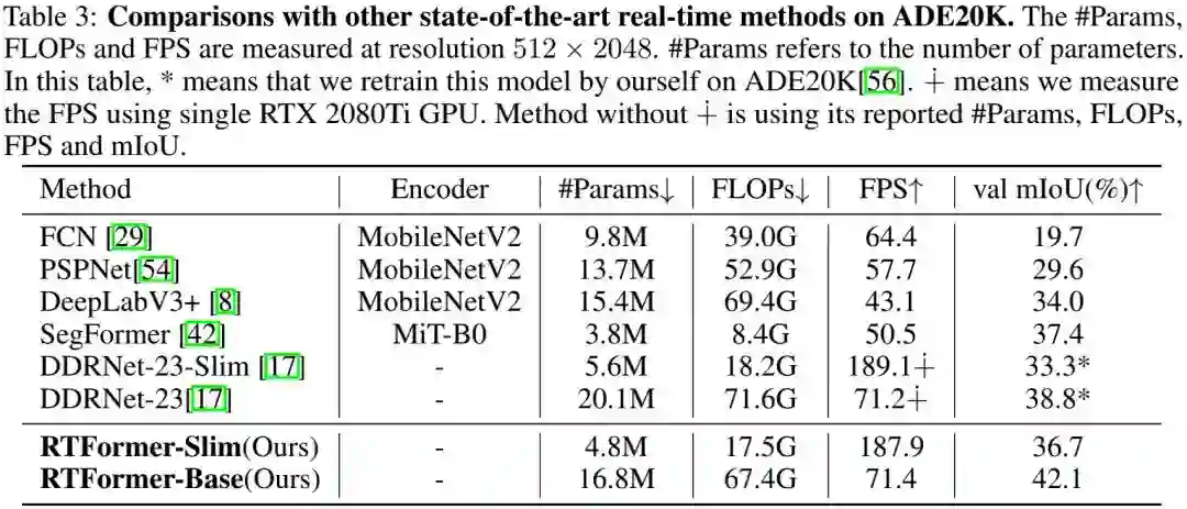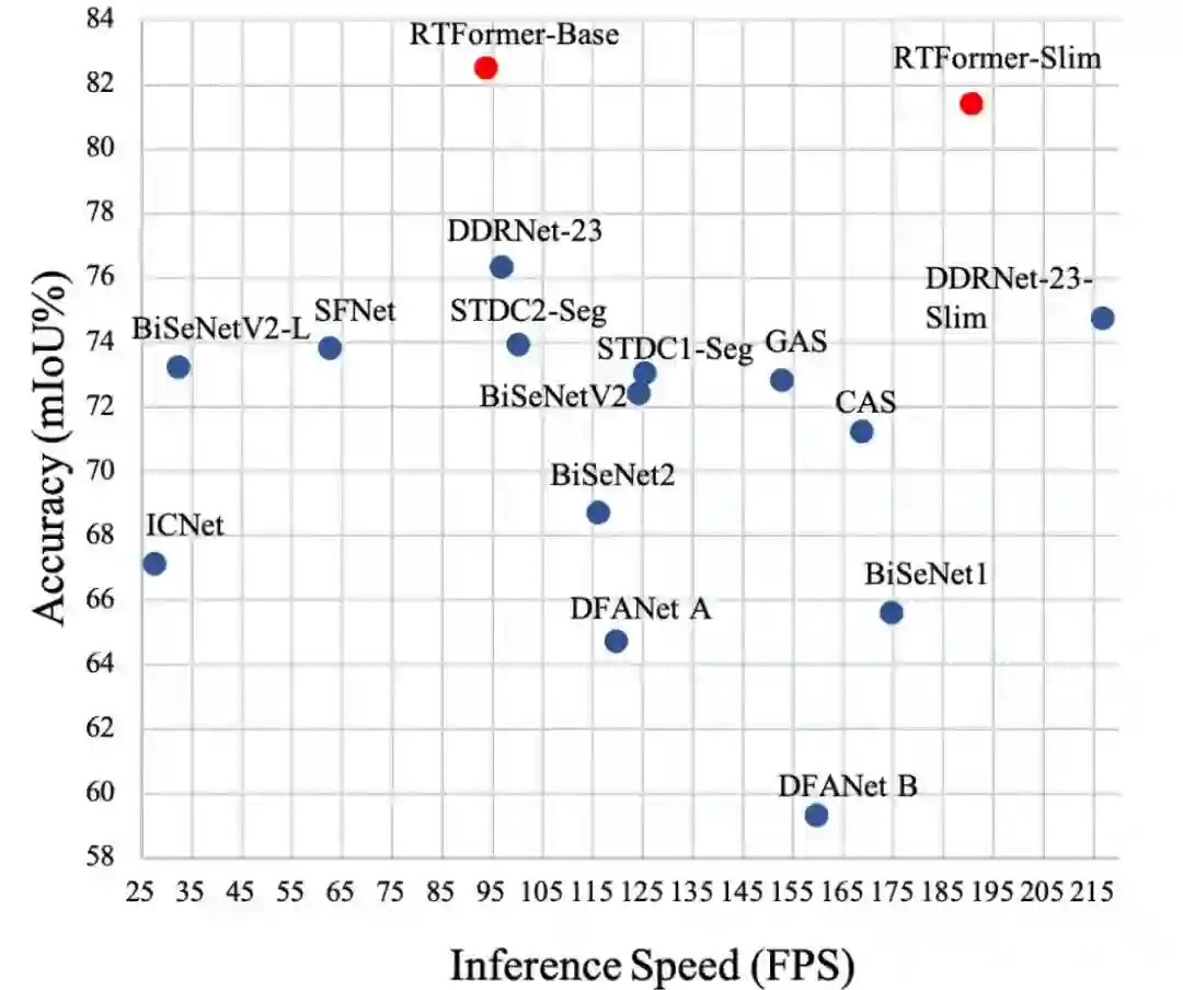 在Cityscapes数据集上,在所有实时分割方案中,RTFormer取得了最佳的速度-精度均衡;