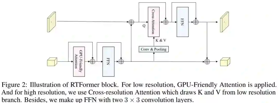 基于上述所提到的两个局限性,本文提出了一种GPU友好的注意力模块与跨分辨率注意力模块,并由此构建了RTFormer。