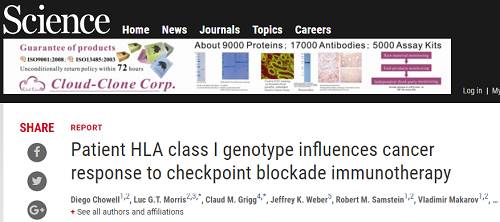 这篇于12月7日发表在Science杂志上的论文证实,人类白细胞抗原(human leukocyte antigen,HLA)基因越多样、变异越多的癌症患者能够更好的响应免疫疗法。