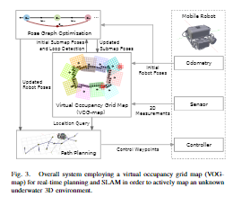 图3 采用虚拟占用网格地图(VOG-map)进行实时规划和SLAM,以主动绘制未知水下三维环境的总体系统。