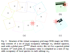 图2 虚拟占据栅格图(VOG-map)的结构。(a)VOG-map由一组局部占据子图mi(点阵)组成,每个子图具有全局偏序集全局i(黑圈)。(b),(c)对于查询的全局位置Xg(红色网格),其占用值被计算为每个子图中局部查询的对数奇数占用的总和。