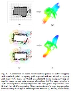 图1 与标准全局占据栅格地图以及我们的虚拟占据栅格地图(VOG-map)相比,活动地图场景重建的质量。(a)world作为标准全局占据栅格地图,用于当前许多路径规划算法。(c)与VOG-map相同的world,能够接受来自SLAM的闭环修正。(b),(d)分别对应于使用(a)和(c)中的world表示的对大型船舶螺旋桨进行相应的三维重建。