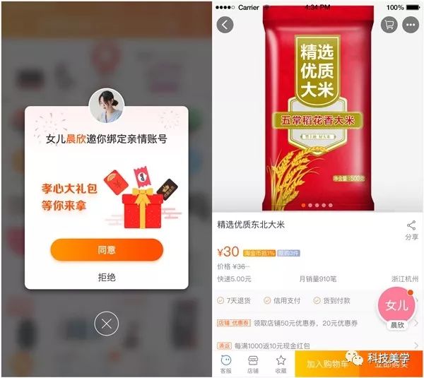 这个功能2月1号就会上线,完成亲情关系绑定后,父母的手机淘宝将切换成专属页面,页面有悬浮的子女用户头像。在任何场景下,父母可以一键唤起子女,发起聊天、电话,发送产品链接来沟通交流,做出购买决策。