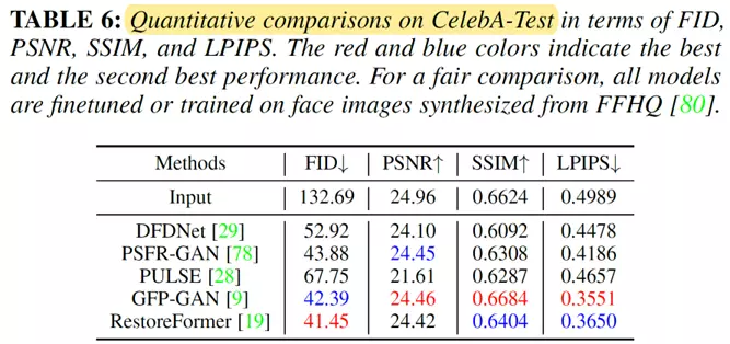 本文总结并测试了一些具有代表性的人脸复原方法在PSNR/SSIM/MS-SSIM/LPIPS/NIQE等方面的性能
