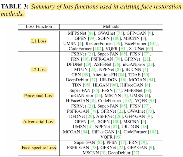 对于人脸复原任务,广泛使用的损失函数有 L1 损失、L2 损失、感知损失、对抗性损失和人脸特定损失,如表3所示。