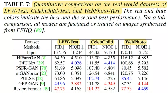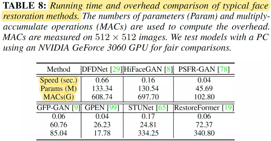 例如,如表8所示,最先进的方法RestoreFormer 有72.37M参数量和340.80G MACs的计算量,这在现实世界的应用程序中部署它是非常困难的。因此,开发具有更少计算成本的模型是未来重要的方向。