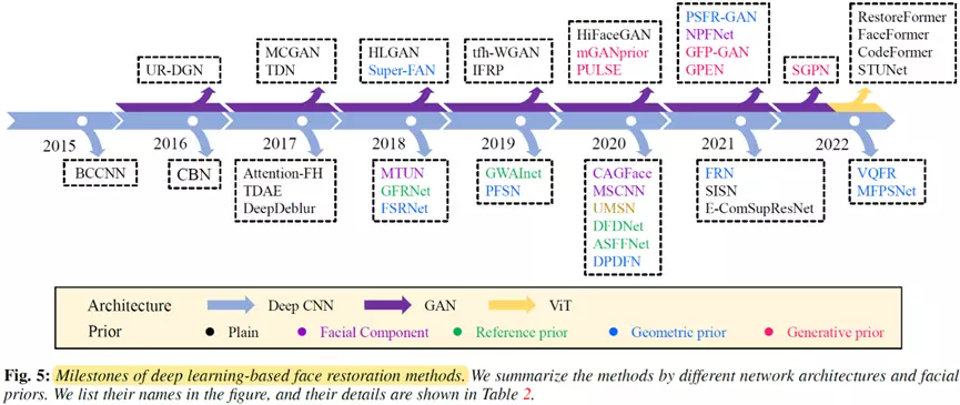 到目前为止,研究人员提出了许多人脸复原算法来尝试解决上述的挑战。下图显示了基于深度学习的人脸复原方法的一个简明的里程碑。