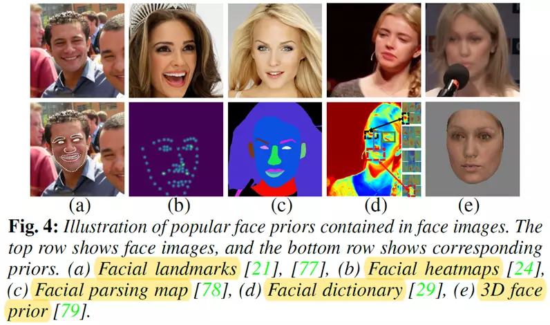 其他先验信息:如下图所示,代表性的先验有人脸landmark,人脸热图,人脸解析图和3D人脸先验;