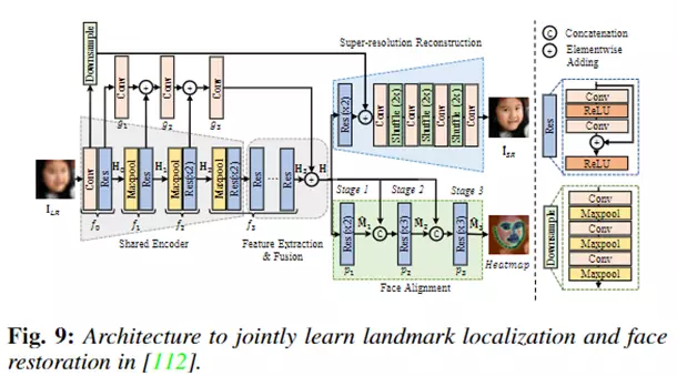 典型的方法如下图所示,研究人员提出了一种联合人脸对齐和人脸超分辨率的网络模型,该方法共同估计人脸的landmark 位置和超分辨率人脸图像。