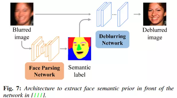 典型的方法如下图所示,研究人员设计了一个人脸解析网络,先从输入模糊人脸图像中提取人脸语义标签,然后将模糊图像和人脸语义标签同时输入一个去模糊网络中来生成清晰的人脸图像。