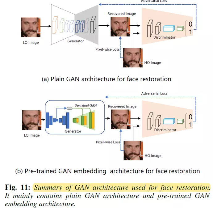 这类方法主要分为两种类型:基于朴素GAN架构的方法(Plain GAN method)和基于预训练GAN嵌入式结构的方法(Pre-trained GAN embedding method)。
