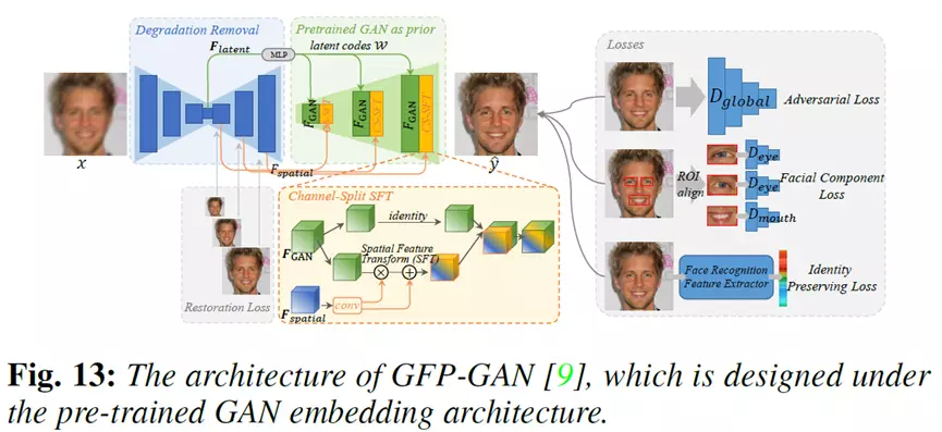 典型的方法如下图所示,研究人员设计了一个GFP-GAN 模型,这个模型主要包含一个降质去除模块和一个基于预训练GAN模型的先验模块,这两个模块通过一个latent code连接和几个通道分割空间特征转换层进行高效信息传递。